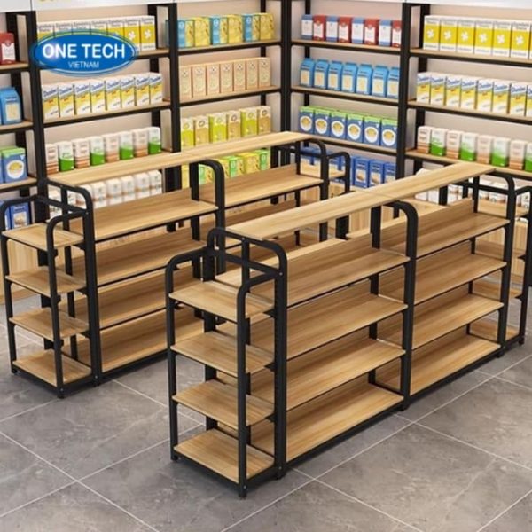 Kệ trưng bày sắt kết hợp gỗ giữa nhà hiện đang là xu hướng được nhiều cửa hàng và chuỗi bán lẻ ưa chuộng. Bởi sự kết hợp hài hòa giữa khung sắt chắc chắn và mặt gỗ sang trọng, vừa đảm bảo độ bền, vừa mang lại tính thẩm mỹ cao. Không chỉ đơn thuần là giá để hàng, mẫu kệ này còn góp phần tạo điểm nhấn cho không gian, giúp cửa hàng trở nên hiện đại, chuyên nghiệp và thu hút hơn trong mắt khách hàng.